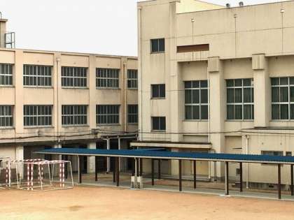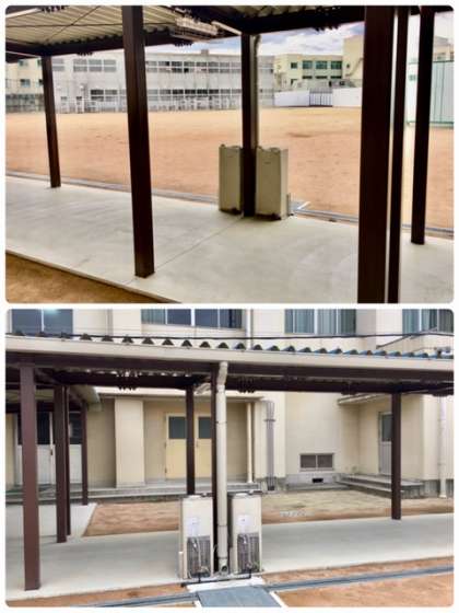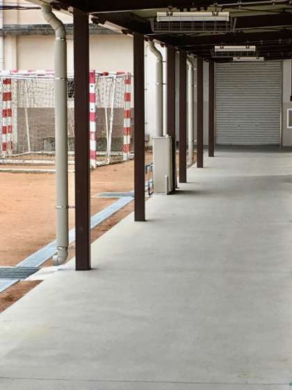 体育館前の渡り廊下にウォータークーラーを設置するための工事を行っています。使用開始まで、もうしばらくお待ちください。