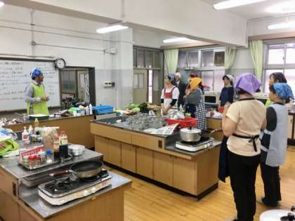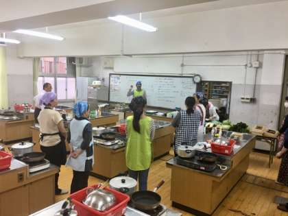 雨模様です。今日は「ふれあい調理実習」の2日目です。今朝も早くから地域ボランティアのゲストティーチャーの皆様にお越しいただきました。
