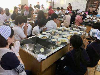 まじないごはんも上手に炊き上がり、すべての調理が時間通りに作る事が出来ました。ゲストティーチャーのボランティアの皆様と食卓を囲んでいただきます。