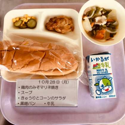 本日の献立は、鶏肉の味噌マリネ焼(ノンドレッシング)、スープ、キュウリとコーンのサラダ、黒糖パン、牛乳です。