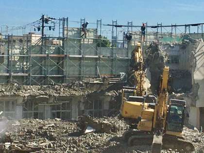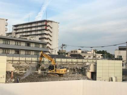 第1校舎の解体工事が進んでいます。2階部分がほとんどなくなりました。徐々に仮囲いも外され、フェリス大和田(大和田診療所)様の建物が見えてきました。
