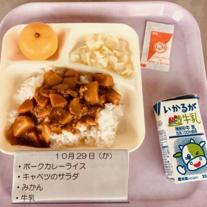 本日の献立は、ポークカレーライス、キャベツのサラダ(ノンエッグドレッシング)、みかん、牛乳です。