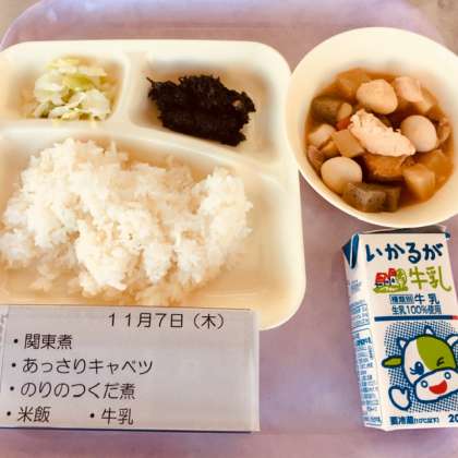 さて、本日の献立は、関東煮、あっさりキャベツ、海苔の佃煮、米飯、牛乳です。