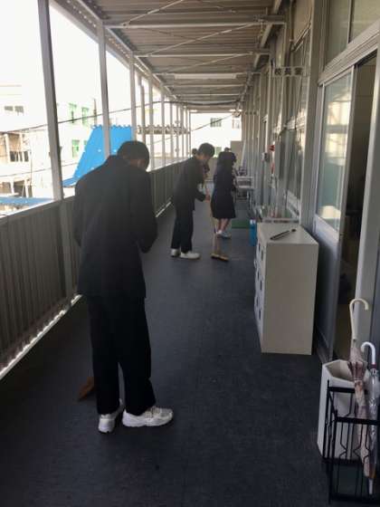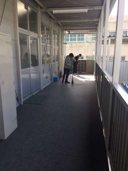 昼休み給食の時間にも関わらず、プレハブ校舎に箒を使って掃除する音が聞こえて来ました。3年3組の掃除当番さんが黙々と掃除をしてくれていました。