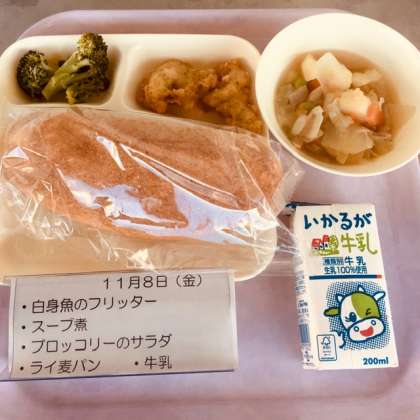 本日の献立は、白身魚のフリッター、スープ煮、ブロッコリーのサラダ、ライ麦パン、牛乳です。