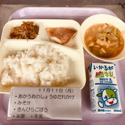 さて、本日の献立は、赤青の醤油タレ掛け、お味噌汁、きんびらゴボウ、米飯、牛乳です。