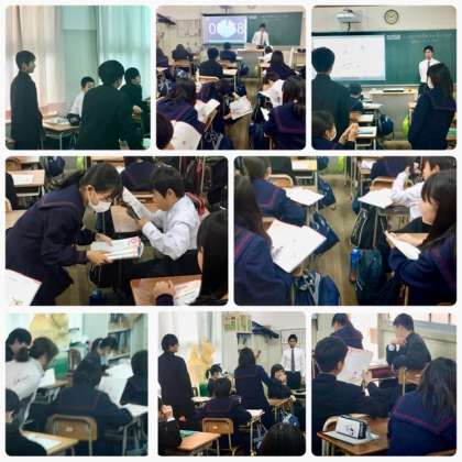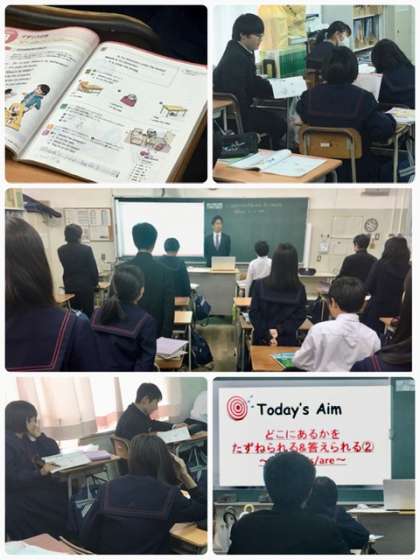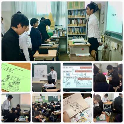 5時間目、1年2組で英語科の研究授業が行われました。スライドを見ながら前置詞の用法について復習しました。とてもわかりやすかったです。また、デジタル教科書を使って短い文章を示してくださいました。生徒は見る・聞く・話す・書くを繰り返し理解を進めています。2人ペアで追っかけ合いする様に英文を読んだり、ストップウォッチを使って時間内に何回も英文を読んだり自然と英語表現が身につく様子は、生き生きと活動していました。授業の最後には、授業の振り返りとともに今日学習した事柄を定着させるために、宿題や次の時間の小テストの課題もしっかり出ています。生徒の皆さん、宿題はできましたか?教えていただいた事柄が残っている間に授業を仕上げましょう。楽しい授業でした。