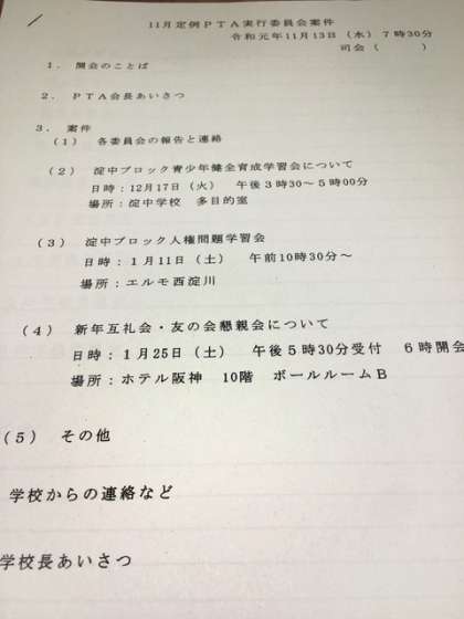 本日、11月定例PTA実行委員会が開催されました。たくさんの実行委員の皆さんに集まっていただきありがとうございました。