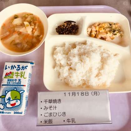 本日の献立は、千草焼(ちぐさやき)、お味噌汁、胡麻ひじき、米飯、牛乳です。