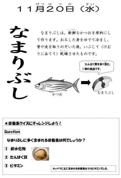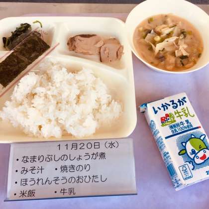 さて、本日の献立はなまり節の生姜煮、ほうれん草のお浸し、お味噌汁、焼き海苔、米飯、牛乳です。