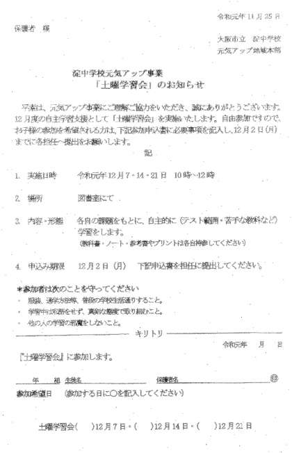 中森先生からは土曜学習会の案内がありました。先週、月曜日に「土曜学習会のお知らせ」を配付しました。たくさんの生徒が参加することを期待します。