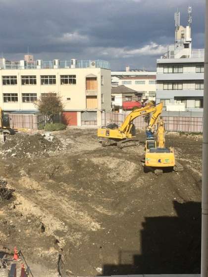校舎建て替え工事の様子です。旧第1校舎の解体は済んだのですが、新校舎建設予定地に昔の解体工事で取り除けなかった地中に埋まっていた基礎部分を取り除く工事が進んでいます。