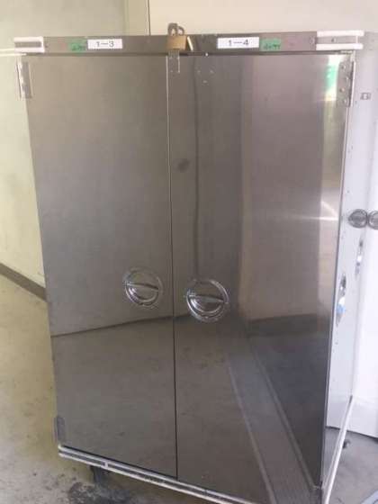 まもなく給食の時間です。配膳員の方々がコンテナを学年校舎の近くまで運んでくださっています。ご覧の通り生徒が給食を取りに来るまで、コンテナは鍵がかけられて異物の混入がないようしてくださっています。安全・安心で美味しい給食の提供くださりありがとうございます。