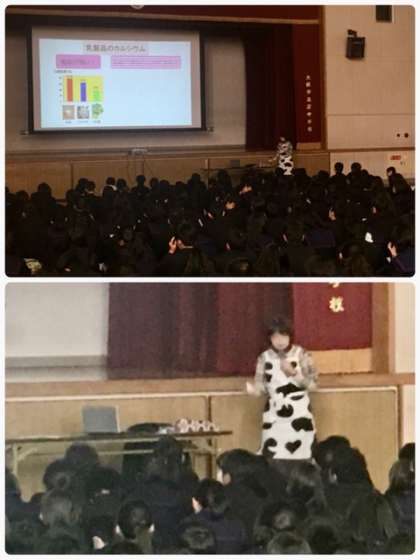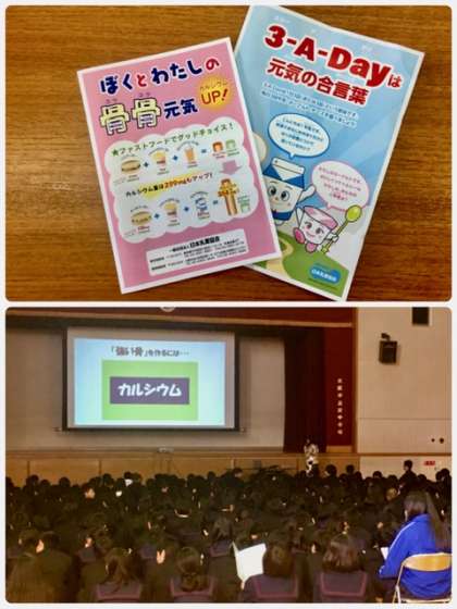 昨年、二学期より学校調理方式の温かい給食が導入されました。給食では毎日、牛乳が提供されています。食事の中での牛乳や乳製品から摂取するカルシウムは、丈夫な骨を形成する為には欠かせません。骨の形成のピークは20歳ごろだと聞きました。また、ダイエットについても教えてくださいました。