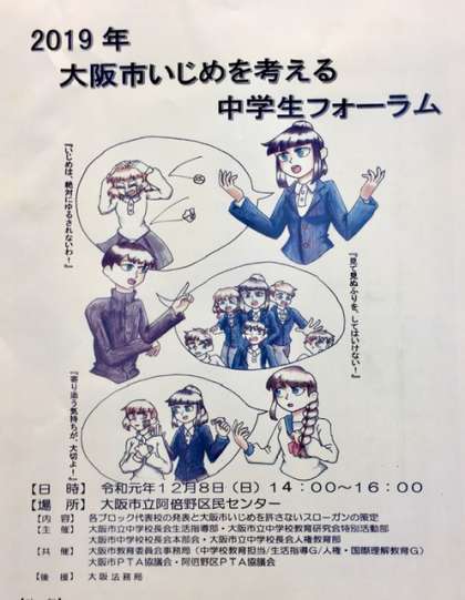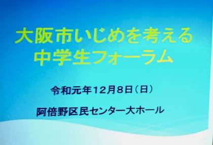 12月8日(日)14時より、阿倍野区民センター大ホールで「大阪市いじめを考える中学生フォーラム」が開催されました。