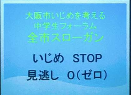 昨日の大阪市いじめを考える中学生フォーラムで、大阪市8つのブロックから発表と取り組みの紹介がありました。各ブロックのスローガンは次の通りです。