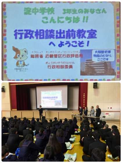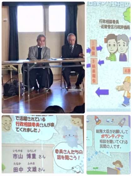 6時間目、3年生は行政相談(出前授業)を受けました。総務省近畿管区行政評価局から平山様と藤井様に来ていただき、立法、司法、行政のお話から、色々な市民の声を受けるボランティアである。行政相談員について話をうかがいました。