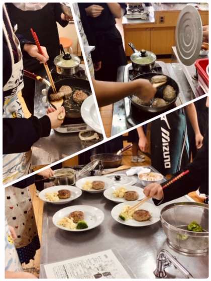 2年4組の家庭科の授業です。調理実習でハンバーグステーキを作っています。ひき肉をこねて成形しフライパンで焼きます。付け合わせに粉吹き芋を作ります。お皿に盛り付けてソースをかけて出来上がりです。