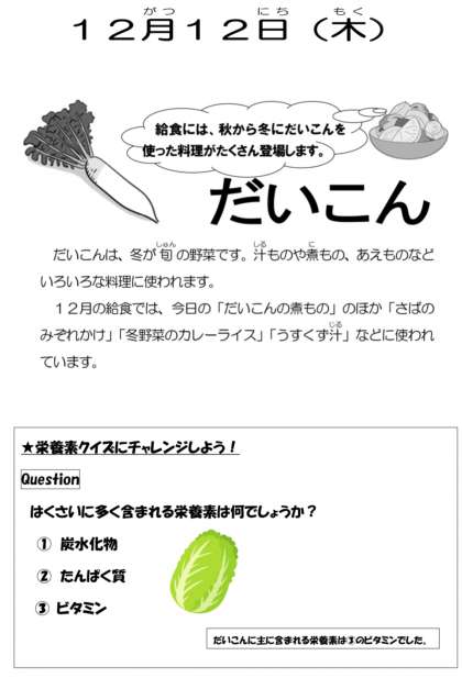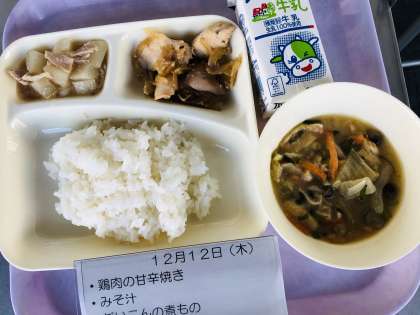 本日の給食は、鶏肉の甘辛焼き、だいこんの煮もの、みそ汁、米飯、牛乳です。いただきます。