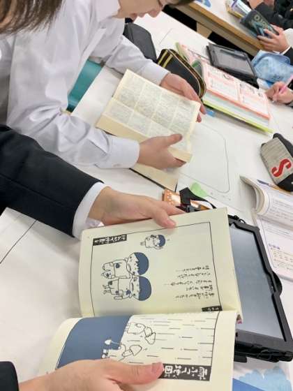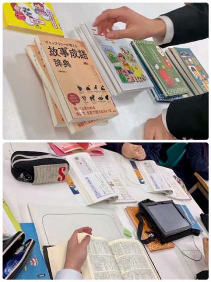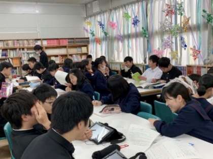 単元「論語」の応用編です。図書室の資料で慣用句、ことわざ、四字熟語の意味や類義語を調べ、意味を理解した上で短文を作成し、自分なりに考えたことをまとめます。本時では資料やタブレットを使用して下調べをしました。次の時間はパワーポイントでプレゼン資料を作成します。