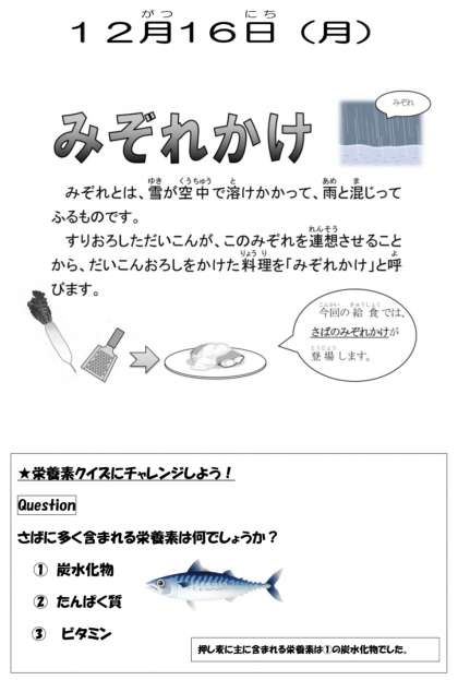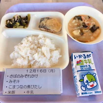 今日の献立は、鯖のミゾレ掛け、お味噌汁、小松菜の煮浸、米飯、牛乳です。