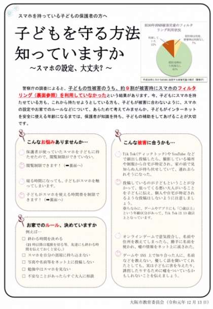 そのような現状を鑑み、学校や家庭において、スマートフォン等の正しい使い方を児童生徒と共に考える際に活用できるよう、大阪市教育委員会でチラシを作成されました。