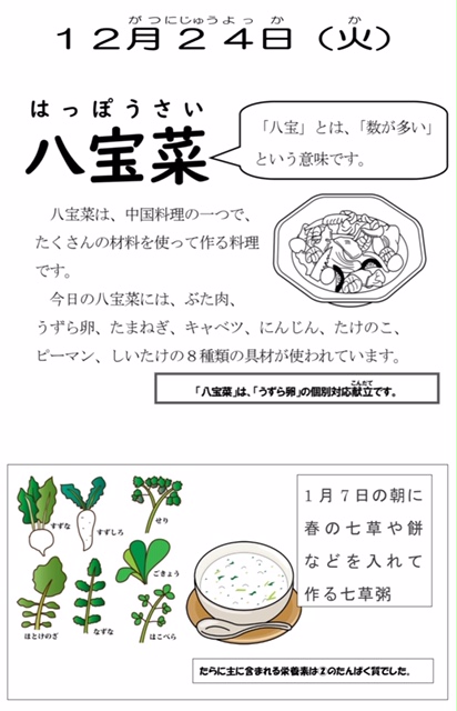 温かく美味しい給食を作ってくださった給食調理員さん、パンやご飯、牛乳を作って届けてくださった生産業者さん、給食のバランスを管理してくださった栄養教諭の北村先生、給食を安全に届けてくださった配送業者さん、生徒たちが給食を時間通りに配膳して片付けてくださった配膳員さん、大変お世話になりました。ありがとうございます。少し早いですが、どうぞよいお年をお迎えください。3学期もよろしくお願いいたします。