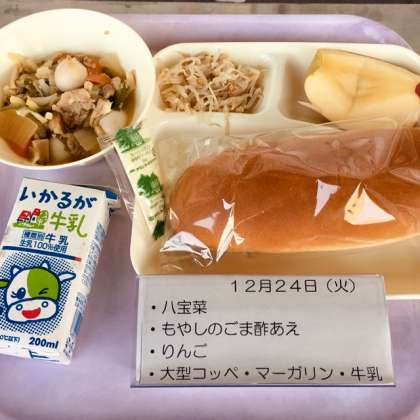 本日の献立は、八宝菜、もやしの胡麻和え、大型コッペパン、マーガリン、りんご、牛乳です。いただきまーす!!