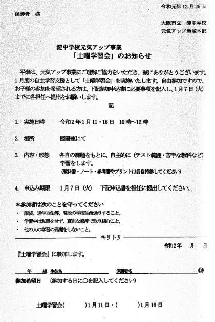 1月の土曜学習会は11日からになります。申し込みは始業式の1月7日です。まだ、参加したことない生徒も、ぜひ参加してください。待っています。