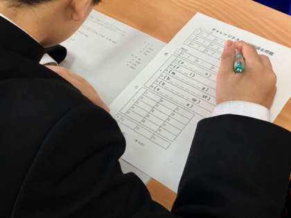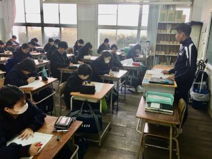 1年2組の英語の授業です。明日に迫ったチャレンジテストに向けて学習しています。過去問題は、家に帰っても何度も取り組んで欲しいです。