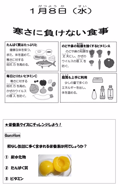 昨日から、爆弾低気圧や猿の目撃情報が入ったり慌ただしい三学期のスタートでした。どんなことがあっても温かく美味しい給食が食べられることは、本当にありがたいですね。三学期も給食よろしくお願いします。