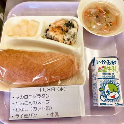 本日の献立は、マカロニグラタン、大根のスープ、ライ麦パン、和梨(カット缶)、牛乳です。