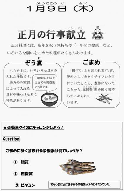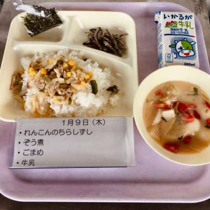 本日の献立は、蓮根のチラシ寿司(きざみ海苔をかけていただきます)、お雑煮、ごまめ、牛乳です。