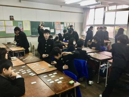 1年生は「百人一首大会」に向けて、盛り上がっています。来週1月24日金曜日に開催される「一年百人一首大会」に向けて、国語の授業や、学級を交流させてこれまで練習試合をしてきました。今日が第3回目で最終日となりました。