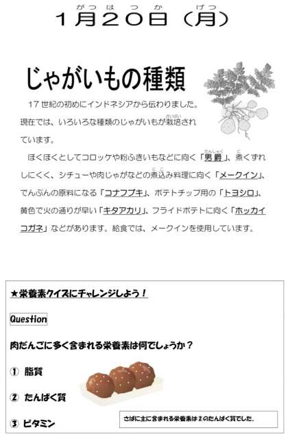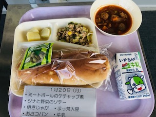 本日の給食は、ミートボールのチャップ煮、ツナと野菜のソテー、焼きじゃが、まっ茶大豆、おさつパン、牛乳です。いただきます。