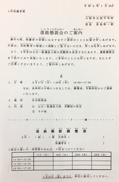 3年生保護者の皆様にお知らせいたします。1月21日「進路懇談会のご案内」を生徒を通じて配付いたしました。ご確認ください。