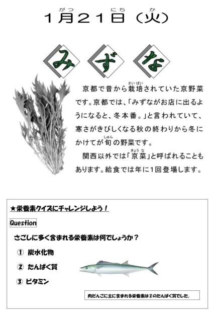 記事によると今日の献立の水菜は、1年間に一回しか登場しないそうです。味わっていただきます。美味しかったねぇ!