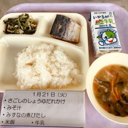 さて、今日の献立は、さごしの醤油ダレかけ、水菜の煮浸し、お味噌汁、米飯、牛乳です。
