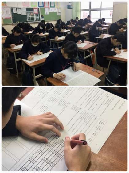 雨の朝です。3年生の学年末テスト2日目がはじまりました。