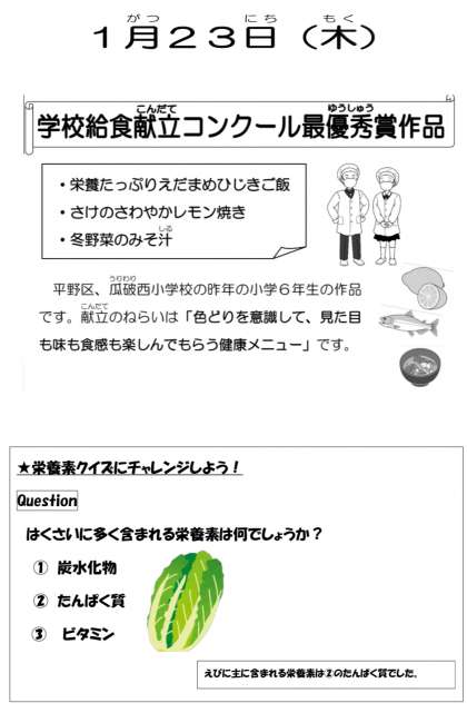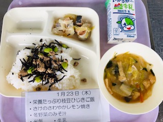 本日の給食は、栄養たっぷり枝豆ひじきご飯、さけのさわやかレモン焼き、冬野菜のみそ汁、牛乳です。いただきます。