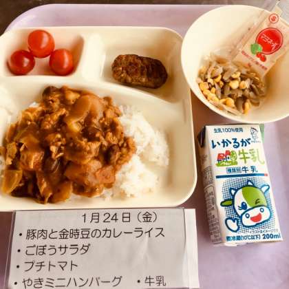 本日の献立は、豚肉と金時豆のカレーライス、ごぼうサラダ、マョネーズ、野菜のミニハンバーグ、プチトマト、牛乳でした。
