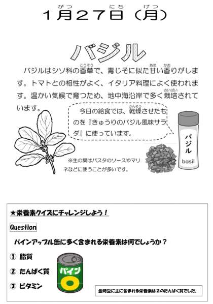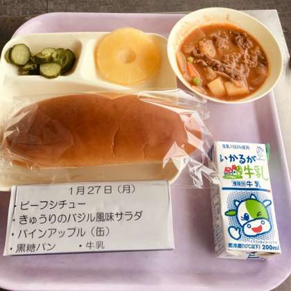 本日の献立は、ビーフシチュー、胡瓜のバジル風味サラダ、パイナップル(缶)、黒糖パン、牛乳です。
