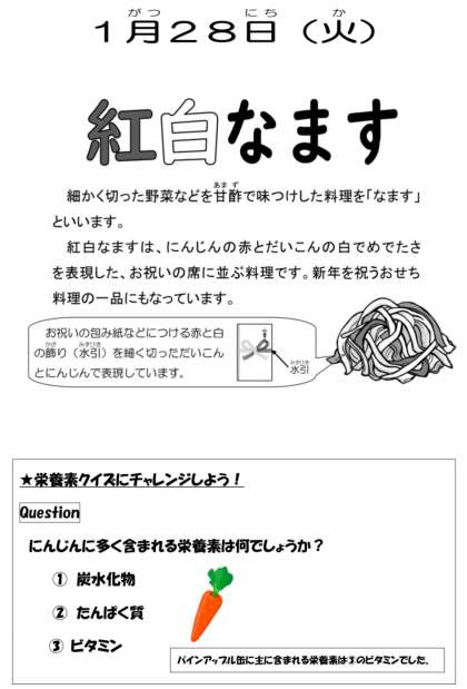 3学期の給食はおせち料理に関わった行事食が続きました。お雑煮、ごまめ、黒豆が献立に登場しました。今日は紅白なますの登場です。