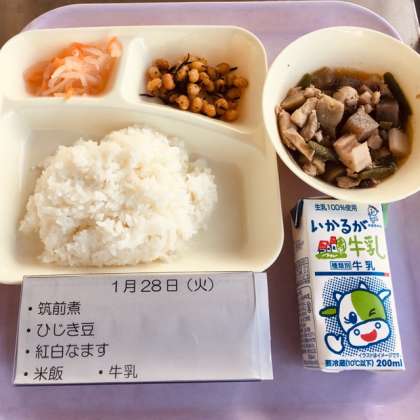 本日の献立は、筑前煮、ひじき豆、紅白なます、米飯、牛乳です。