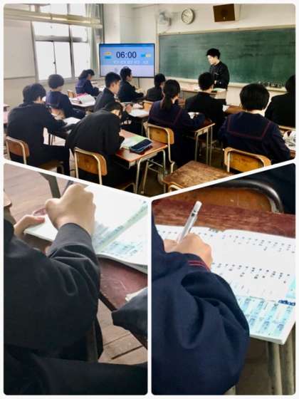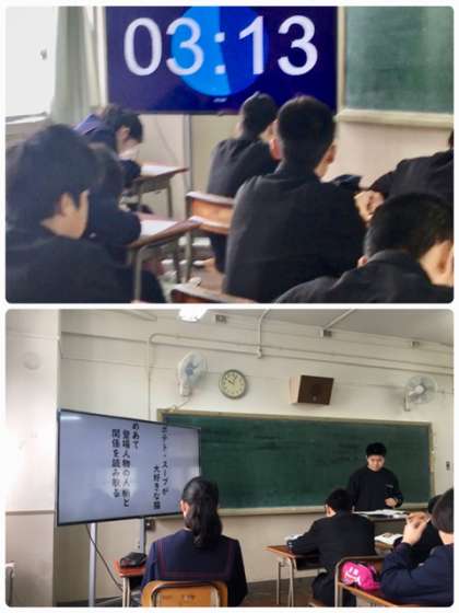 2時間目2年4組で国語科の研究授業(公開授業)が行われました。単元「ポテト・スープが大好きな猫」です。今回の授業では、現代文(小説)を読んで登場人物やその性格、人柄と関係を読み取る学習です。授業の最初には、いつもの、漢字小テストから始まりました。とても集中して、予習に熱心に取り組んでいる姿に感心しました。音読の前に具体的な指示が示され、何に取り組むかが明確な授業でした。少人数授業できめ細やかに授業は進められていました。
