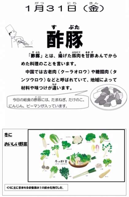 この間、お正月だったのに今日で1月が終わります。1月の給食は時折、おせち料理が出てきて楽しかったです。給食調理員さんありがとうございました。