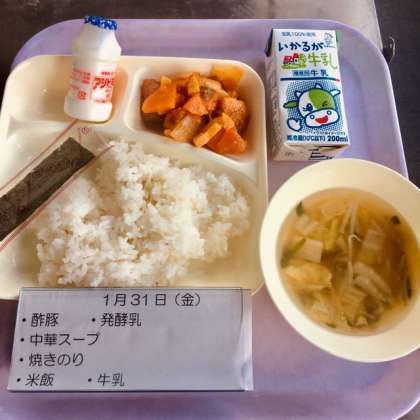 本日の献立は、酢豚、中華スープ、米飯、焼きのり、牛乳、発酵乳です。
