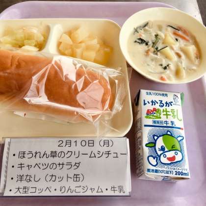 今日の献立は、ホウレン草のクリームシチュー、キャベツのサラダ、大型コッペパン、りんごジャム、洋梨(カット缶)、牛乳です。
