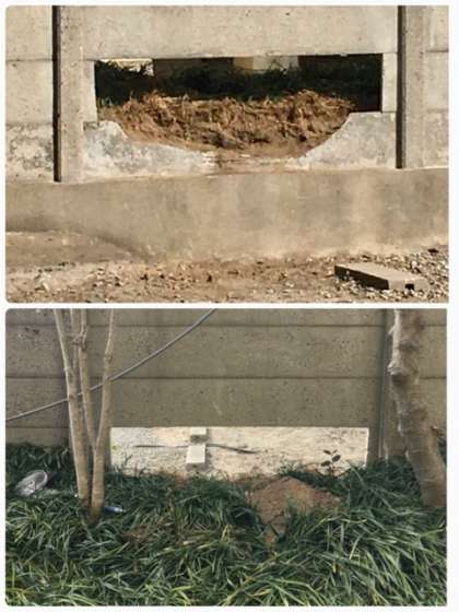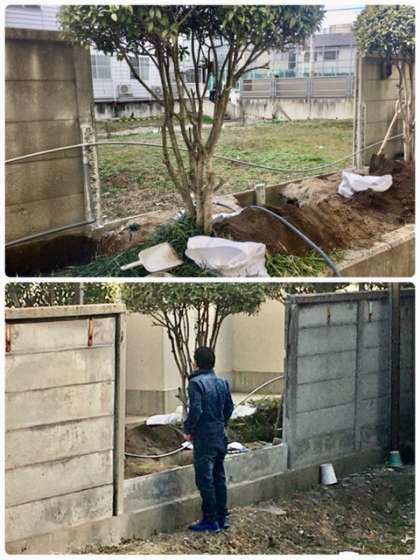 体育館横、校舎外側の塀が老朽化のため一部外塀を改修する工事がはじまりました。今週末には完成する予定です。