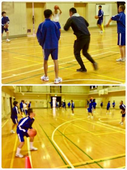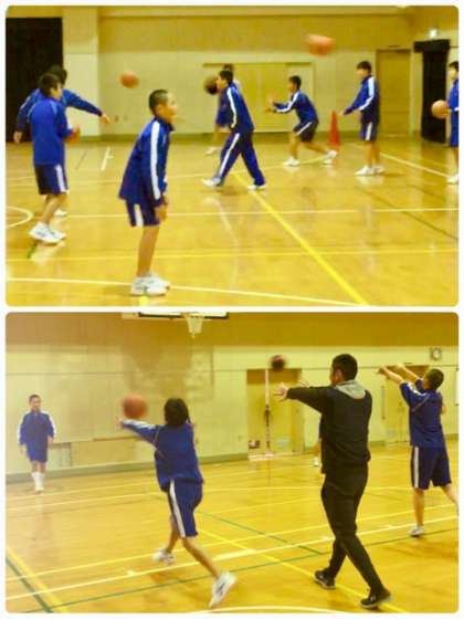 2年男子体育の授業の様子です。バスケットボールを学習しています。生徒たちは、田中先生の丁寧な指導に元気よく練習しています。